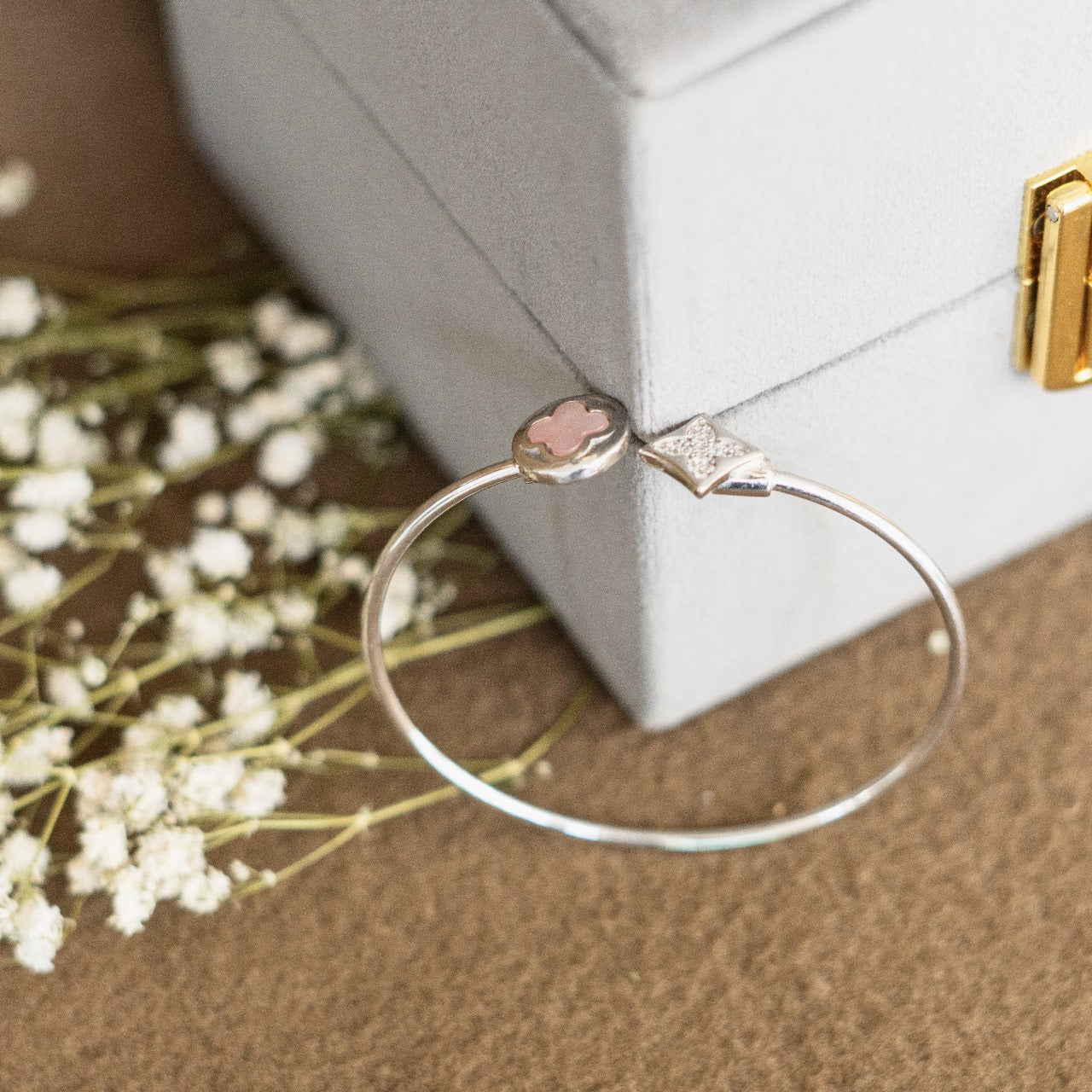 Store in a dry place and avoid exposure to water, perfume, and chemicals. Clean with a soft cloth to maintain shine.